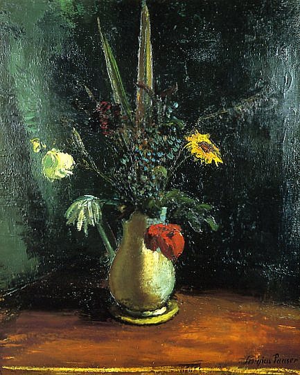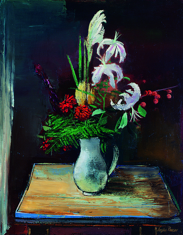 Blumen in hellem Krug, 1946 oder früher, Öl,court. im Kinsky, Wien